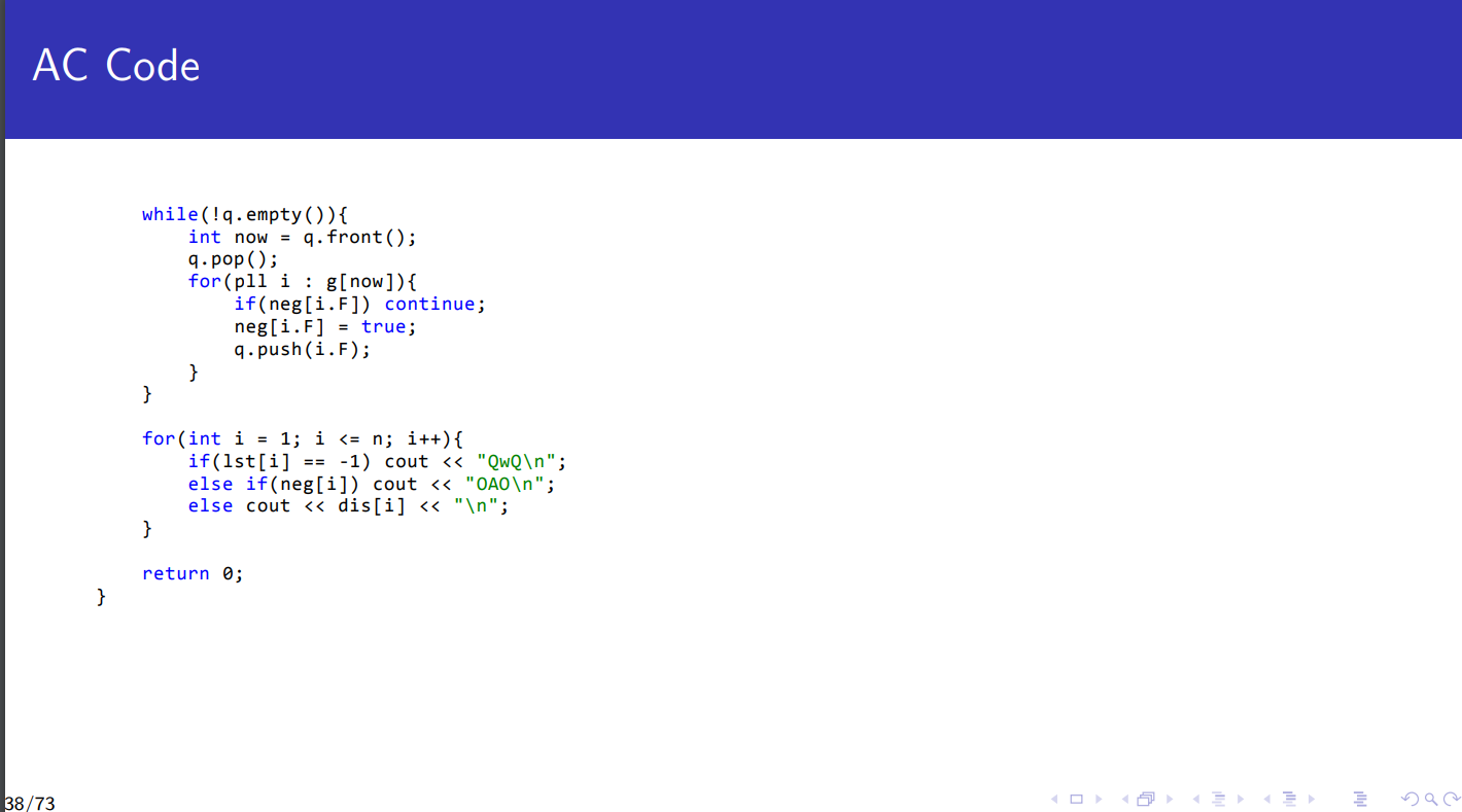 - 輸出 \(n\) 行,其中第 \(i\) 行包含一個整數,表示從節點 \(1\) 走到節點 \(i\) 的最短路徑長,如果無法走到 \(i\),輸出 QwQ;如果從節點 \(1\) 到 \(i\) 的路徑長可以任意小,輸出 OAO。