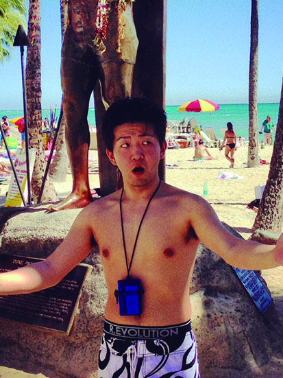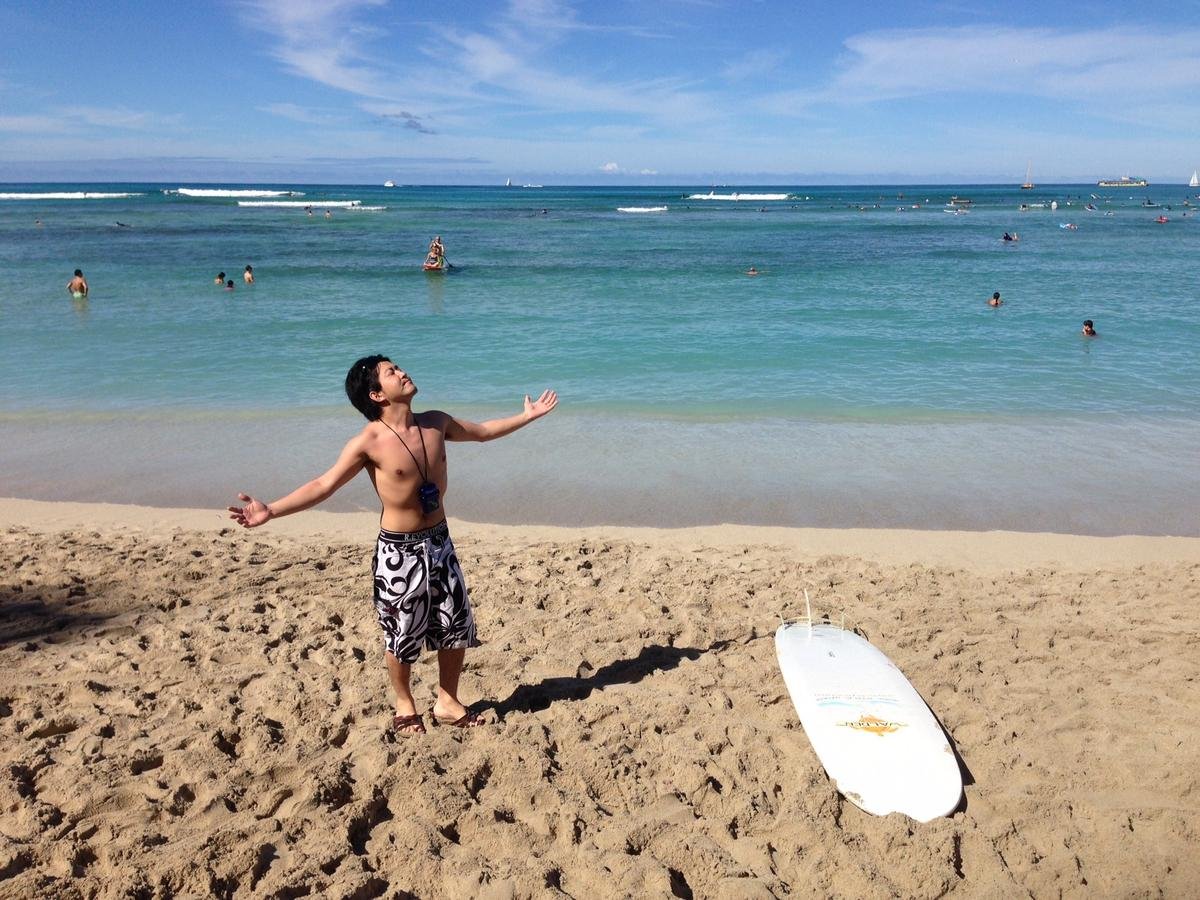 I have been to HAWAII with him. We did a lot of swimming at waikiki. And we ate a lot of delicious food.