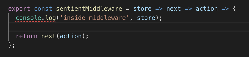 Middleware is a curried function which receives current store, next middleware in the chain, and current action They are connected during the creation of store: