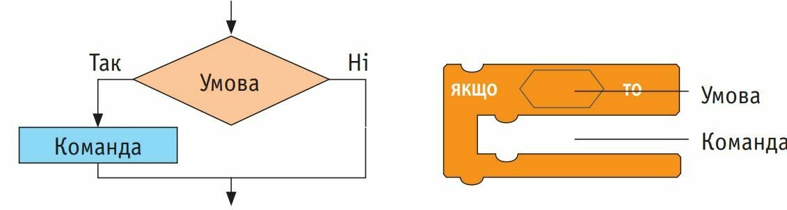 Порівняйте блок-схему неповного розгалуження і відповідну команду