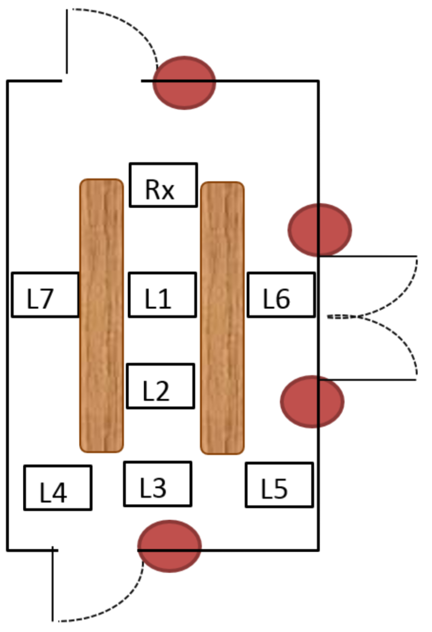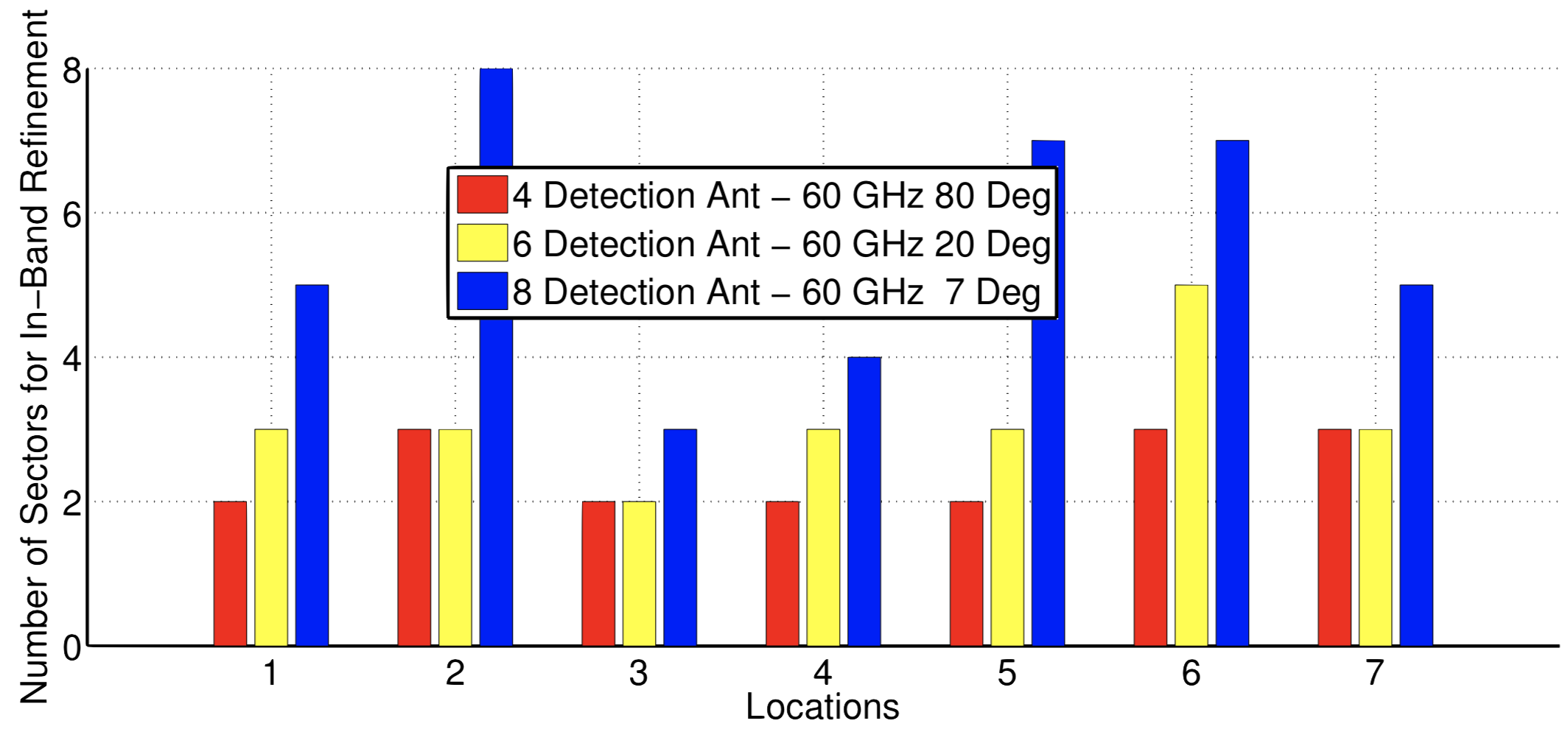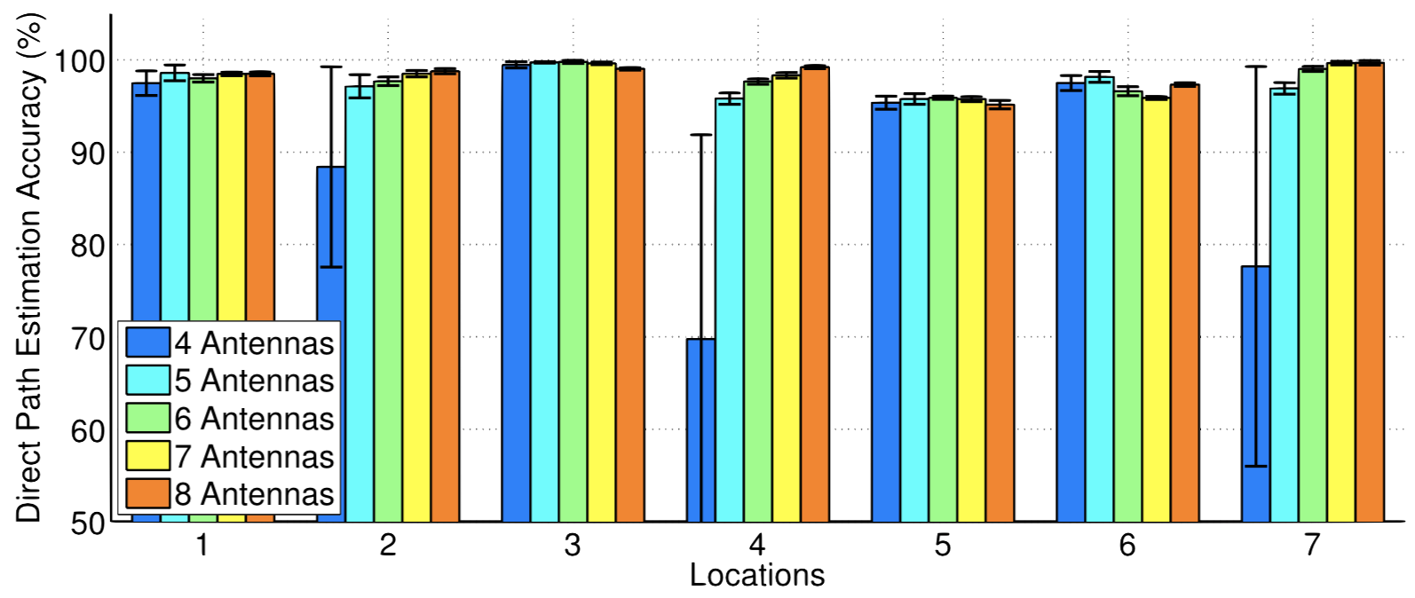 Fig.: Detection accuracy of direct path for 8 to 4 detection antennas in 7 evaluated locations.