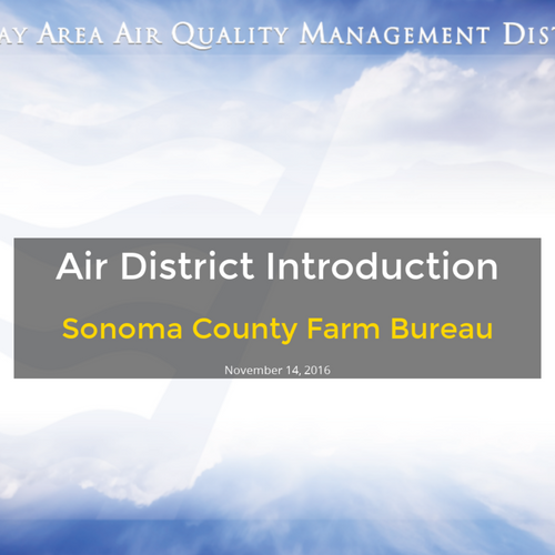 Presented to the Sonoma County Farm Bureau on November 14, 2016. The Air District provides grants for ag businesses to meet compliance measures. Spread the word and apply for grants at: http://www.baaqmd.gov/grant-funding. Additionally, we provide grants to teachers starting community gardens and engaging in science activities, visit: http://www.baaqmd.gov/grant-funding/residents/community-grants-program. And we offer paid high school internships and youth leadership development opportunities through our Spare the Air Youth Program and annual YES Conference. Learn more at: www.sparetheairyouth.org.