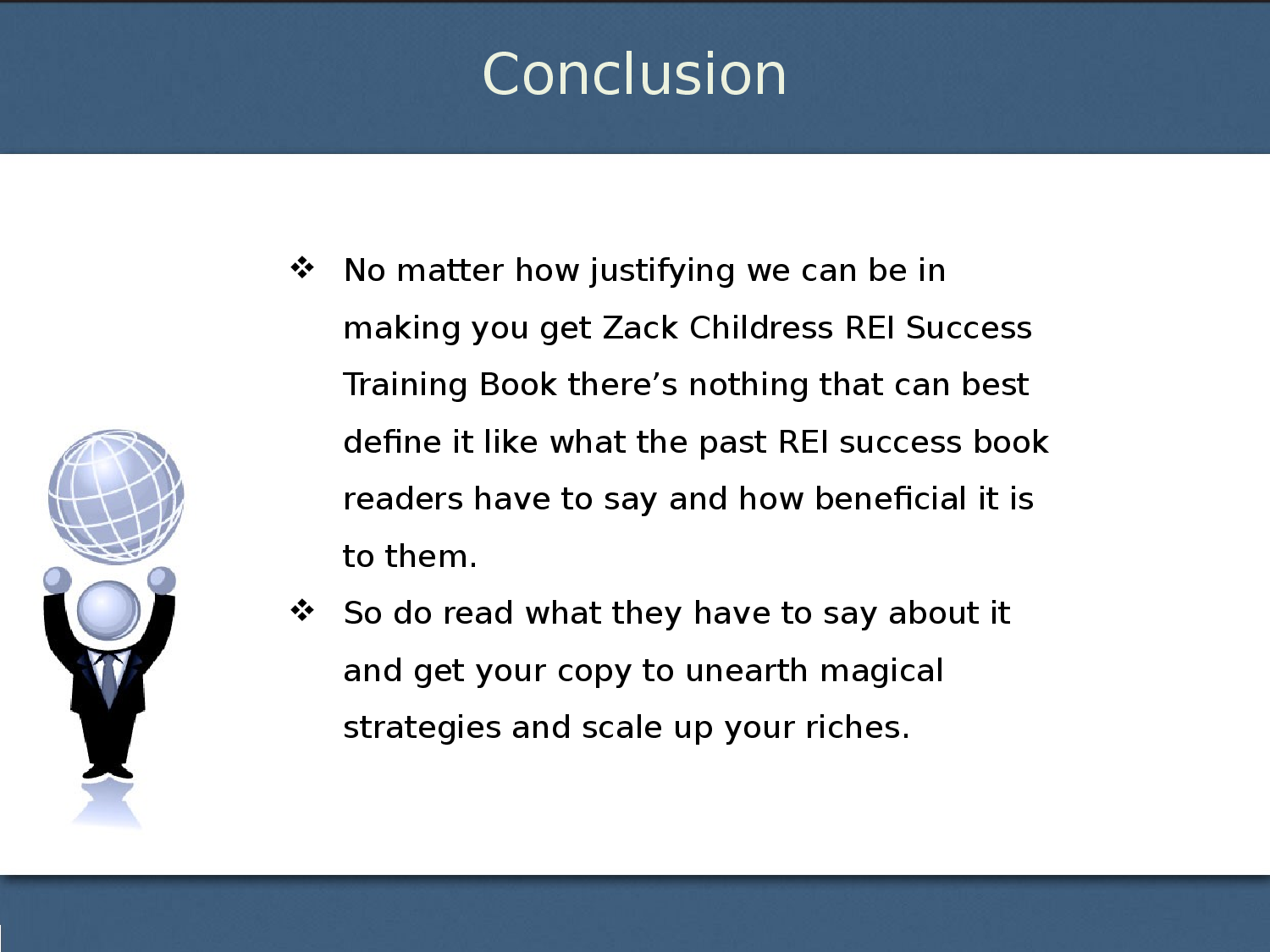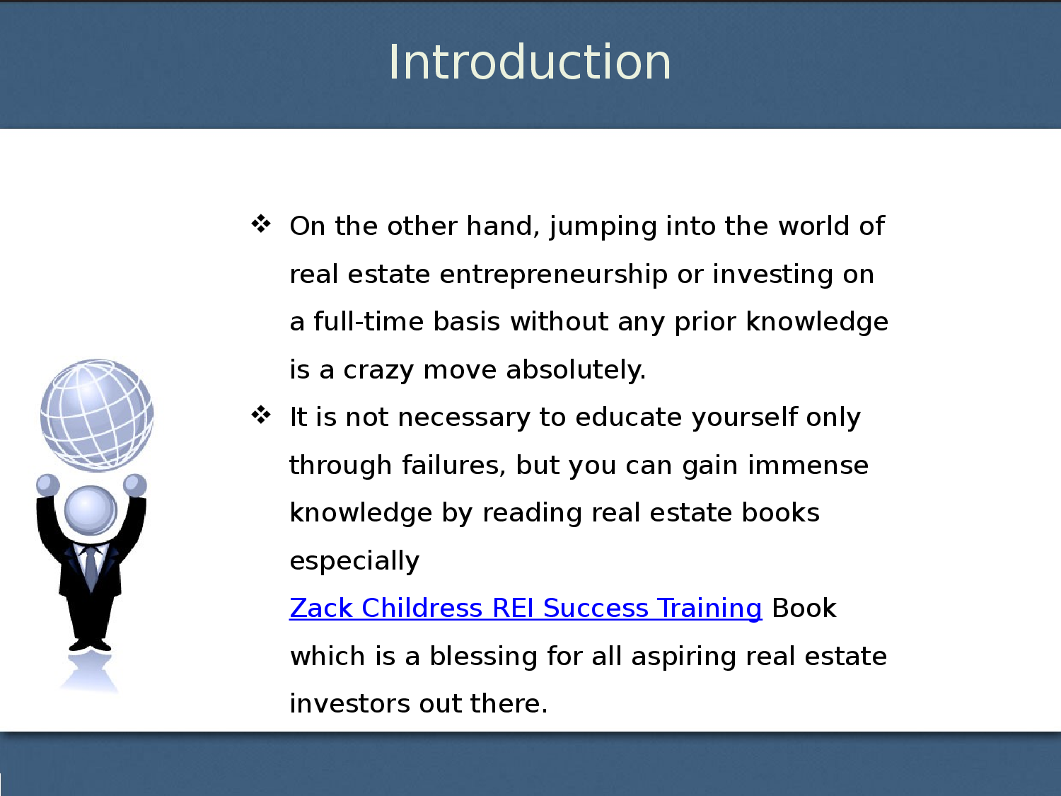 Real estate investors who wanted to know what works best in today’s fluctuating and volatile real estate market should definitely get Zack Childress REI Success Training Book and you will not regret.