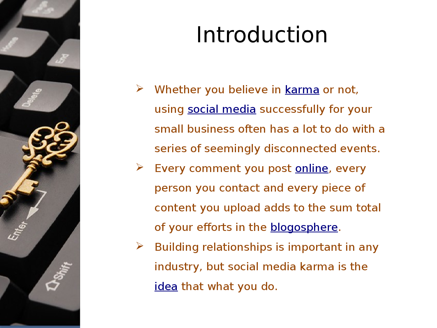Whether you believe in karma or not, using social media successfully for your small business often has a lot to do with a series of seemingly disconnected events. Every comment you post online, every person you contact and every piece of content you upload adds to the sum total of your efforts in the blogosphere. Building relationships is important in any industry, but social media karma is the idea that what you do and how you behave will ultimately have an effect on you directly or indirectly.