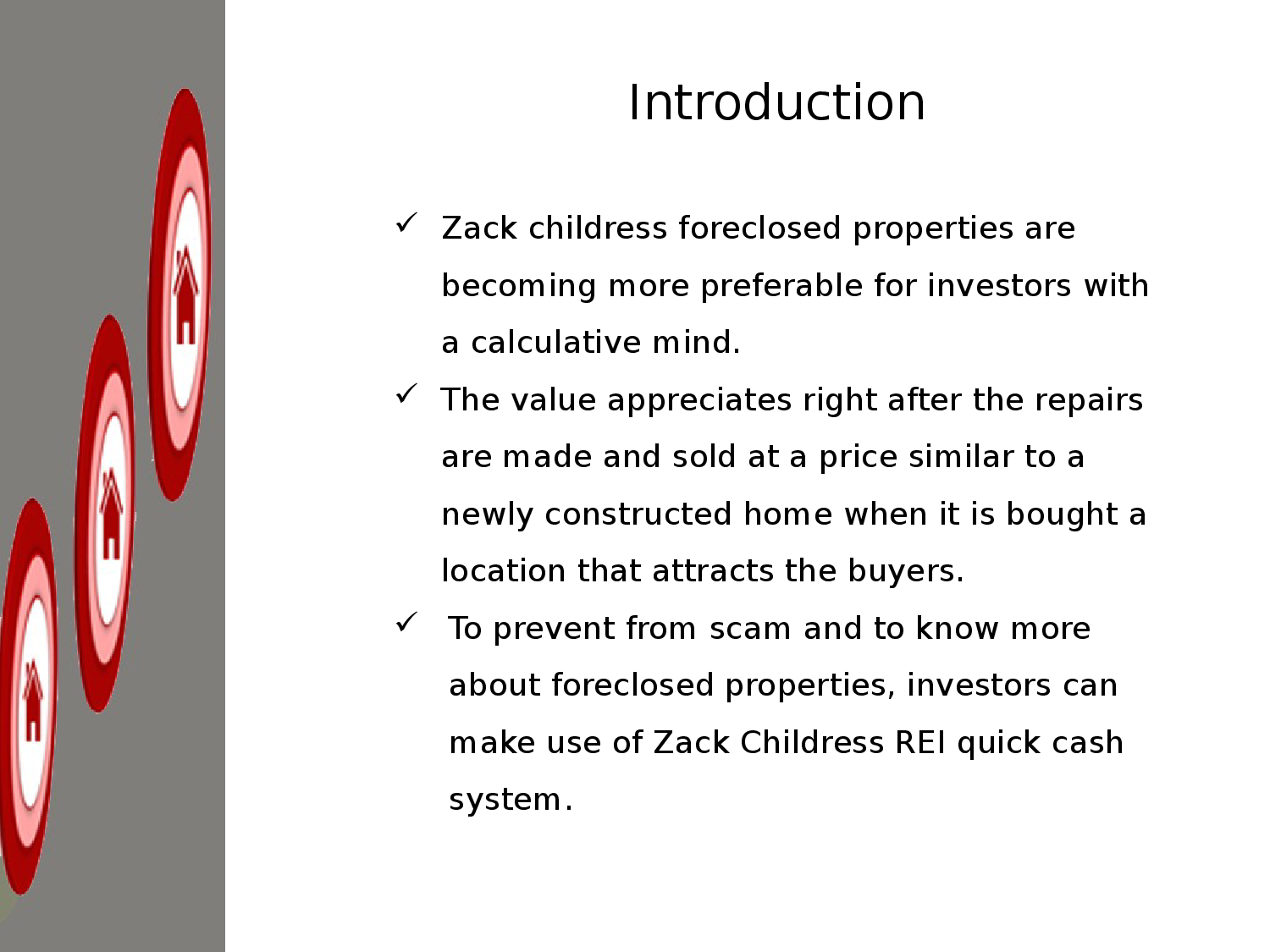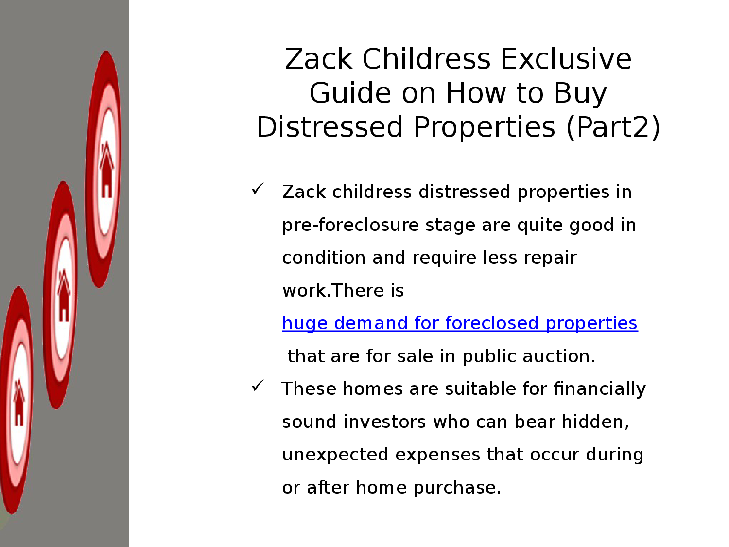 Zack childress foreclosed properties are becoming more preferable for investors with a calculative mind.Zack Childress’s educates the fellow investors with this comprehensive guide on how to purchase foreclosed home, brings out the positive features of the distressed homes.