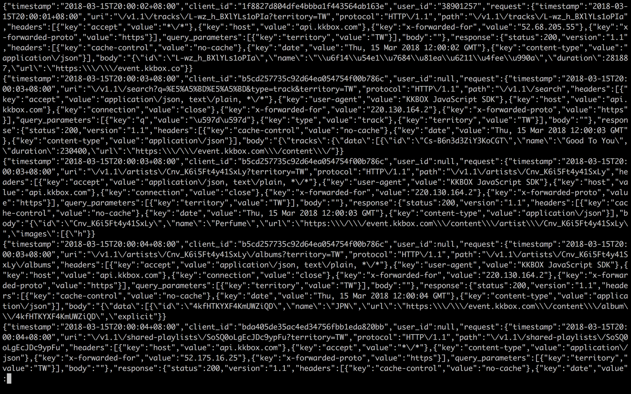 | "demo id2" | "/v1.1/charts" | "Authorization" | "Bearer access_token" | "territory" | "TW" | 200 | "2017-11-21T15:00:03+09:00" |