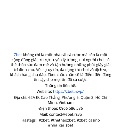 Zbet không chỉ là một nhà cái cá cược mà còn là một cộng đồng giải trí trực tuyến lý tưởng, nơi người chơi có thể thỏa sức đam mê và tận hưởng những phút giây giải trí đỉnh cao. Thông tin liên hệ: Website: https://zbet.rsvp/