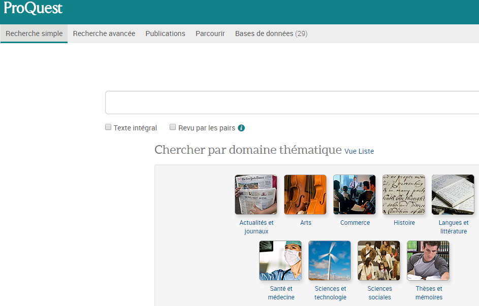 - Plateforme ProQuest (bases de données en langues et lettres, bases de données en arts, bases de données en sciences sociales)