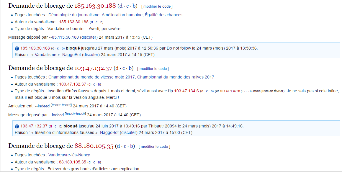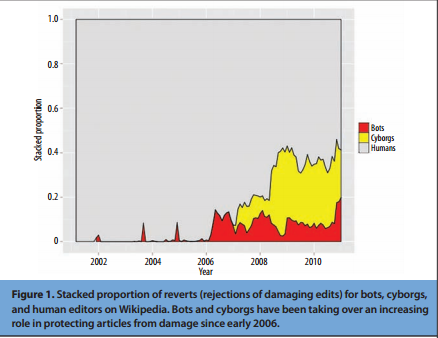 Référence : Aaron Halfaker and John Riedl (Université du Minnesota), « Bots and Cyborgs: Wikipedia’s Immune System », IEEE Computer Society, mars, 2012, p. 80.