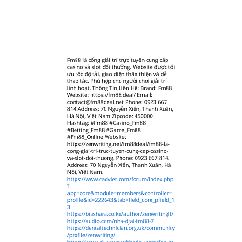 Website: https://zenwriting.net/fm88deal/fm88-la-cong-giai-tri-truc-tuyen-cung-cap-casino-va-slot-doi-thuong. Fm88 là cổng giải trí trực tuyến cung cấp casino và slot đổi thưởng. Website được tối ưu tốc độ tải, giao diện thân thiện và dễ thao tác. Ph