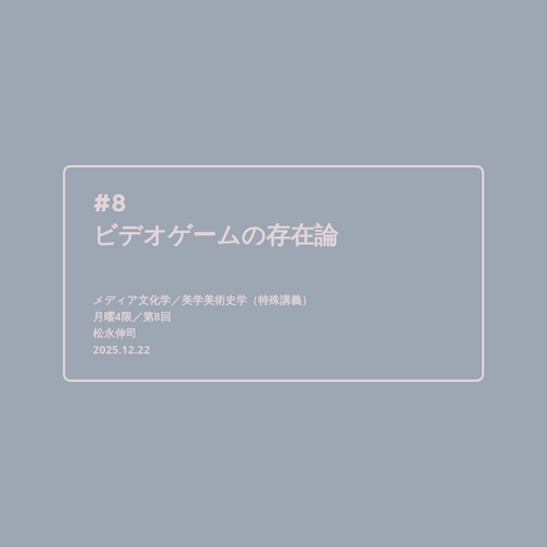 授業の内容は、ところどころ拙著『ビデオゲームの美学』(慶應義塾大学出版会、2018年)の内容と重なる部分はあると思いますが、本にない話もけっこうする予定です。