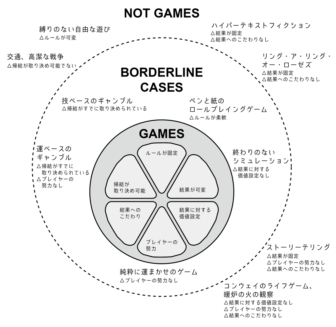 一方で、条件の一部を満たさないものもある。そうした微妙な事例を「ゲーム」と見なすか見なさないかは理論的選択だが、大きな問題ではない。「ゲーム」の範囲を広くとりたいか、狭くとりたいかという話でしかない。