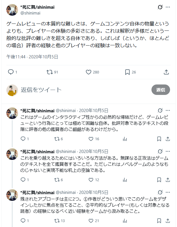 ビデオゲーム批評の難しさについては、東京大学文学部美学芸術学研究室の2020年度卒論「ビデオゲーム批評の批評」がクオリティの高い議論をしている。非公開物だが研究室に行けば保存論文を見せてくれるらしい。