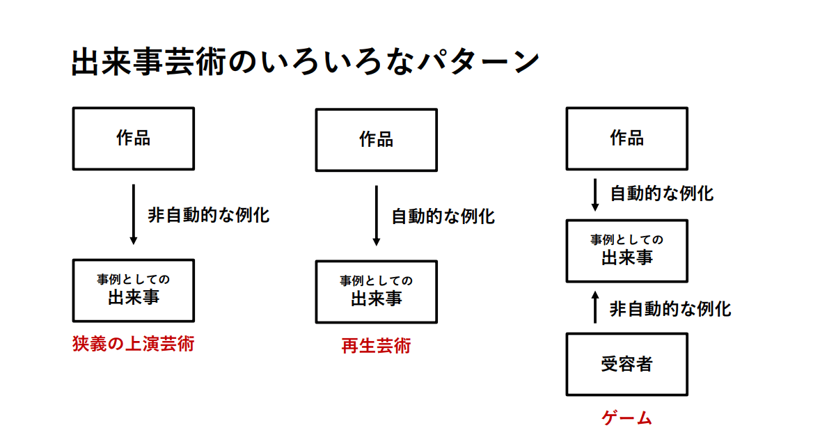 それゆえ、ゲーム(ビデオゲームを含む)は複数芸術であり、かつ、ゲームにおける作品の事例は出来事であると言ってよい。この点だけ見れば、ゲームは音楽や演劇などの上演芸術に近い。